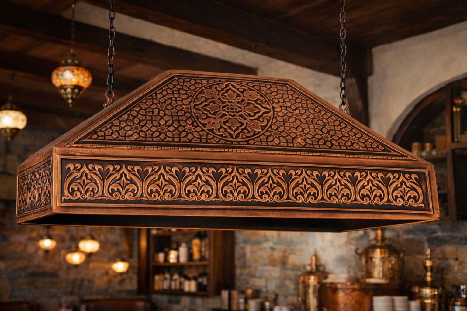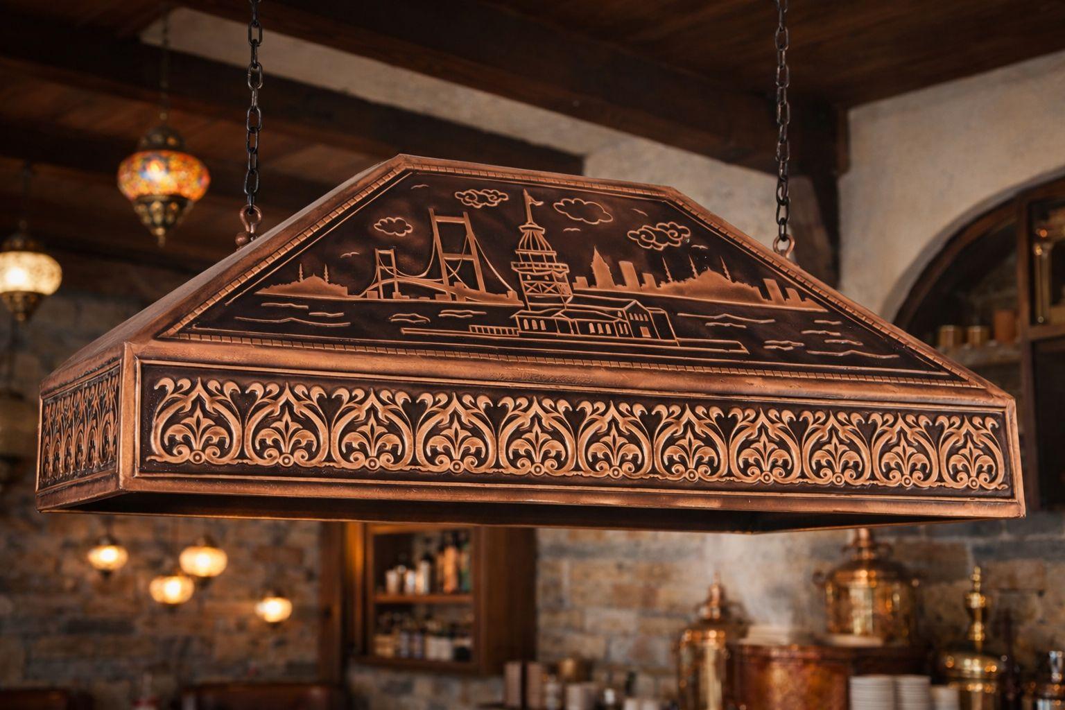Bakır davlumbaz tavan tipi işlemeli çay ocağı davlumbazıdır.Bakır davlumbazları dışı tamamen bakır işlemli olarak üretilmektedir.90CM uzunluğundadır.45 cm en genişliği ile üretilmektedir.